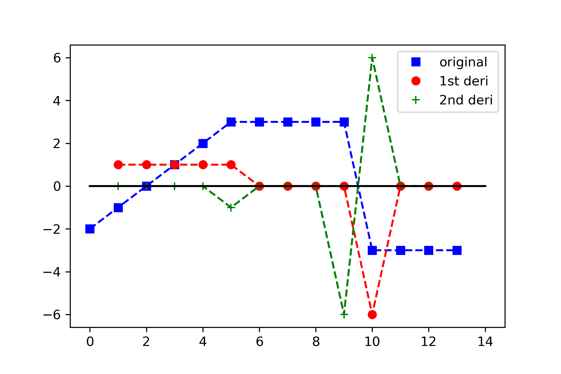 상단 그림에서 빨간색 원은 1차 미분입니다. 파란색 사각형이 0~5까지 1의 크기로 늘어나고 있기 때문에 1~5까지의 1차 미분값은 1이 됩니다. 초록색 십자형은 2차 미분입니다. 즉, 1차 미분을 한번 더 미분한것이라고 볼 수 있습니다. 1차 미분은 1~5까지는 값이 동일하기 때문에 1~4까지의 2차 미분값은 0입니다. 이때, 여기서 가장 눈여겨 볼 부분은 2차 미분이 음수에서 양수로 변화하는 x = 10인 부분입니다. 이 부분은 이미지 처리에서 zero-crossing이라고 해서 이미지의 가장자리(edge)를 추출해낼 수 있는 부분으로 간주하고 있기 때문에 이미지 처리를 공부하신다면 반드시 알아두어야할 개념입니다.