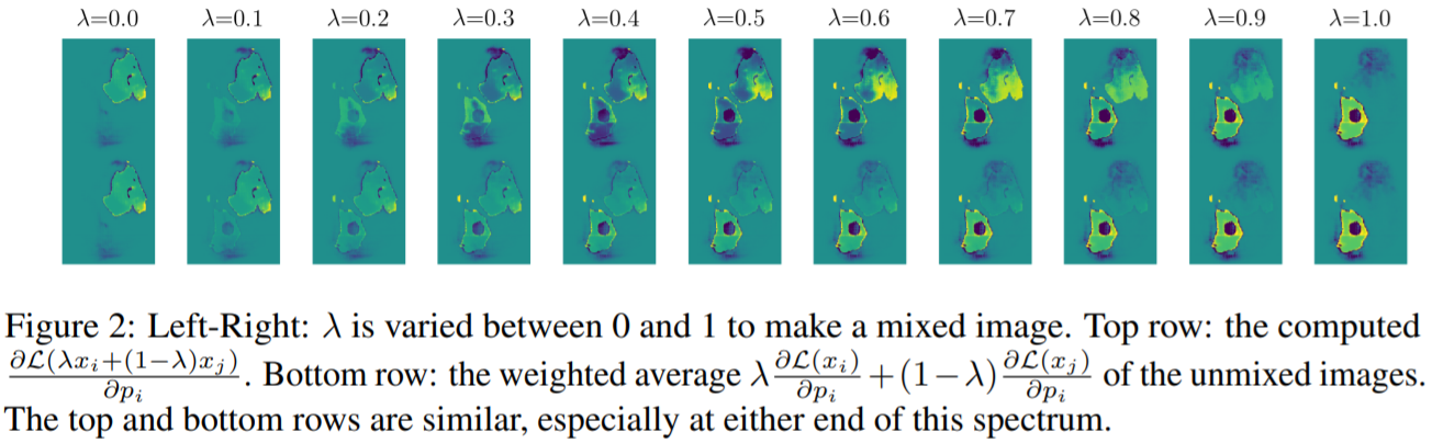 Figure2의 위쪽 사진은 $\frac{\partial L}{\partial p_{i}}(\gamma x_{i} + (1-\gamma) x_{j})$의 결과이고 Figure2의 아래쪽 사진은 $\gamma \frac{\partial L}{\partial p_{i}}(x_{i}) + (1-\gamma)\frac{\partial L}{\partial p_{i}}$의 결과를 보여주고 있습니다. $\frac{\partial L}{\partial p_{i}}$의 값은 Dice loss 미분의 weighted average와 비슷한 것에 주목할 필요가 있습니다. Dice loss의 미분은 mix한 patch들로부터의 미분의 가중합과 거의 유사합니다.