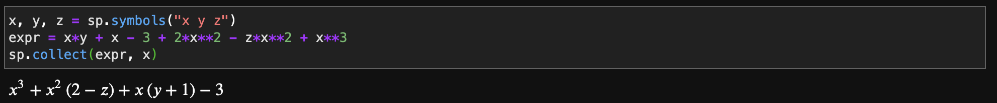 collect 함수는 특정 변수를 차수로 묶어주는 역할을 하는 함수입니다. 예를 들어 $x$의 3차식, 2차식, 1차식끼리 묶어서 표현해준다는 말입니다.