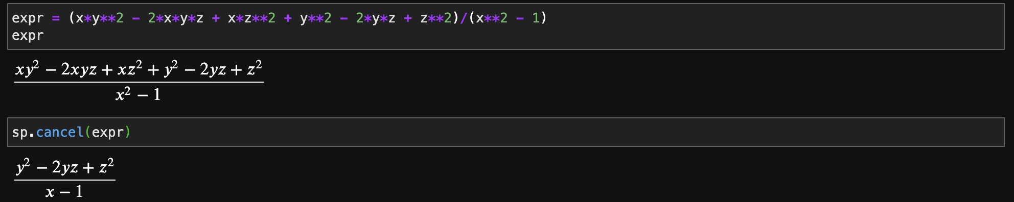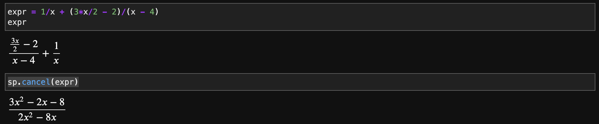 cancel 함수는 유리식을 간단하게 만들기 위해서 "소거(cancel)"와 통분을 하는 함수입니다. 굉장히 직관적이기 때문에 쉽게 알 수 있습니다. 바로 예시를 보면 쉽게 이해할 수 있습니다.