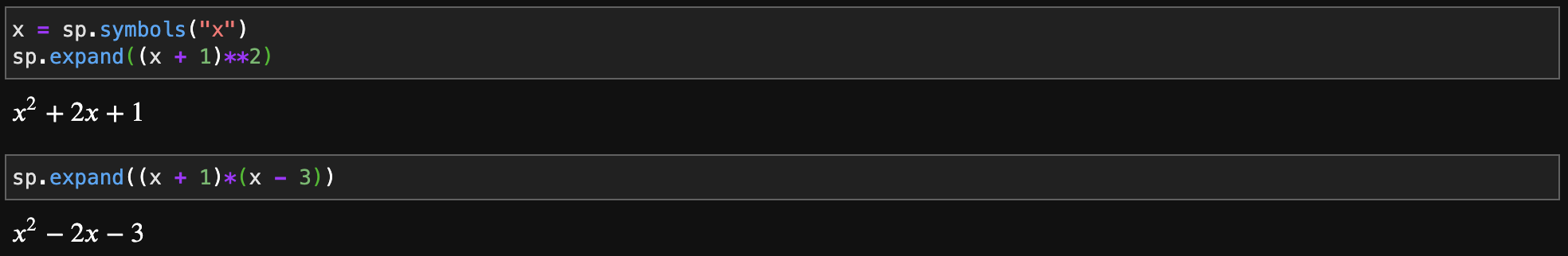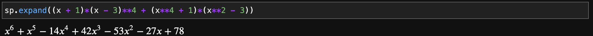expand 함수는 주어진 다항식을 전개하는 함수입니다. 예를 들어서 $(x + 1)^{2} = x^{2} + 2x + 1$과 같이 말이죠. 두 말할 필요없이 몇 가지 예제를 보시면 바로 알 수 있습니다.