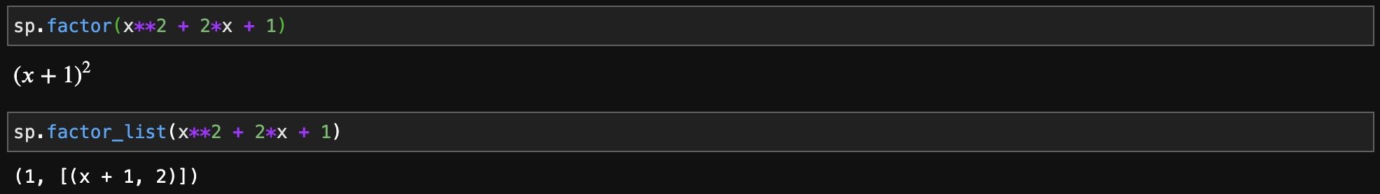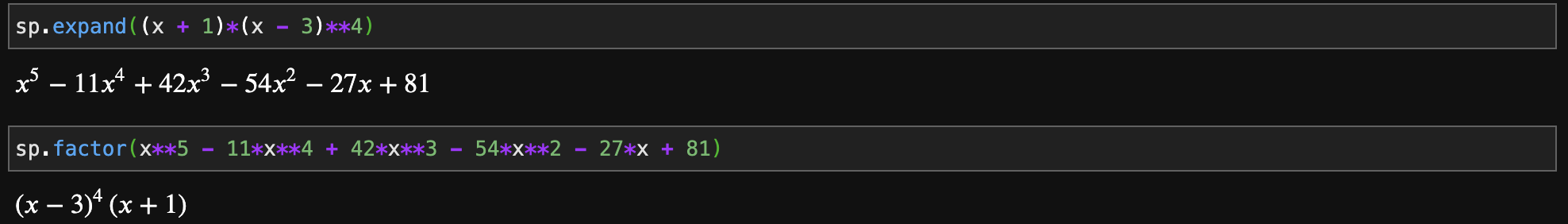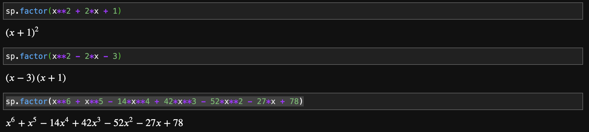 위의 결과부터 하나씩 보시면 위에서 2번째까지는 expand 함수를 반대로 하는 것을 볼 수 있습니다. 하지만, 마지막 결과는 그대로 덧셈을 반환하고 있습니다. 이유는 factor 함수는 덧셈이 아닌 오직 곱셈으로만 표현가능한 수식을 알려주기 때문입니다. 마지막 수식은 곱셈 + 곱셈의 형태였기 때문에 다항식 간의 곱셈이 가능한 조합을 찾을 수 없어서 그냥 그대로 나온 것이라고 보시면 됩니다. 실제로 그냥 곱셈만 있는 수식의 경우에는 복잡하더라도 아래와 같이 잘 동작하는 것을 관찰할 수 있습니다.