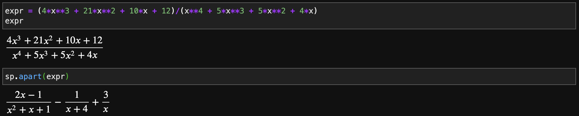 apart 함수는 고등학교 때 흔히 배우는 "부분 분수(partial fraction decomposition)"을 수행하는 함수입니다. 이 역시 간단하니 예제를 보고 지나가도록 하겠습니다.