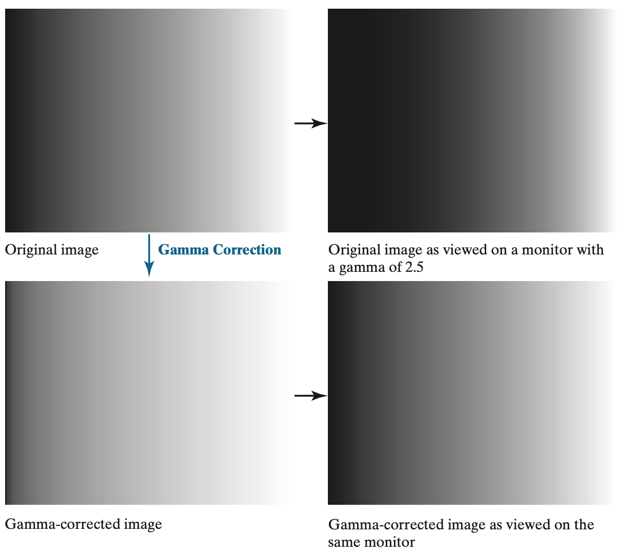 위와 같은 감마 변환은 기본적으로 모니터와 같은 영상 출력 장치에서 사용될 수 있습니다. 아래 그림과 같이 실제 영상을 모니터로 보면 밝기가 왜곡이 발생하는 데, 이를 보정하는 역할을 감마 변환이 맡아줍니다.