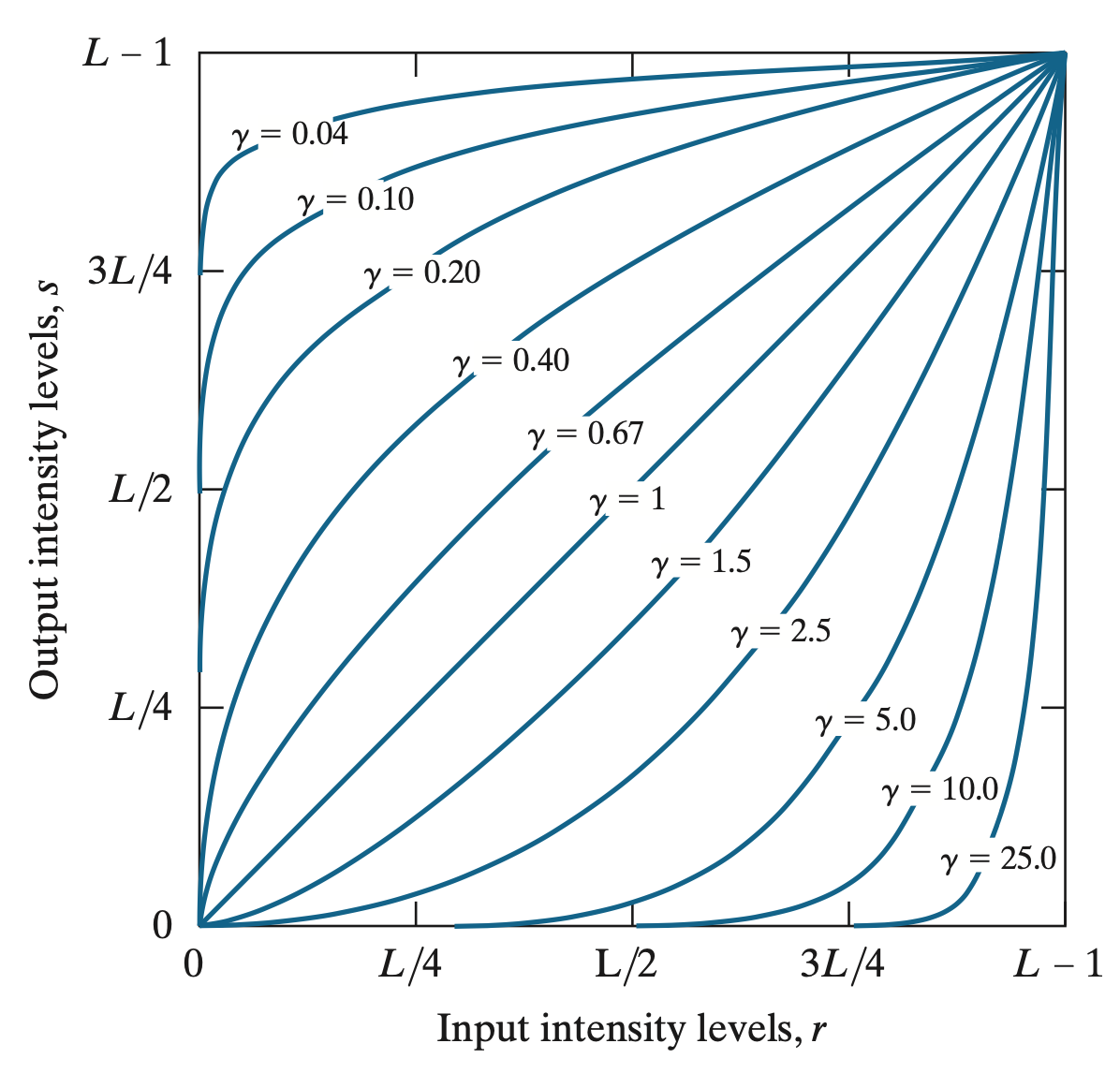 먼저 상단의 로그 함수 그림부터 보도록 하겠습니다. 만약, 입력 영상의 밝기가 $[0, \frac{L}{4}]$라고 가정하겠습니다. 그러면 출력 영상의 밝기는 $[0, \frac {3L}{4}]$로 밝기 범위가 더 늘어난 것을 볼 수 있습니다. 다음으로 입력 영상의 밝기가 $[\frac {3L}{4}, L-1]$이라고 하면 출력 영상의 밝기의 범위는 더 줄어들게 됩니다. 이것은 어떤 의미를 지니는 걸까요? $[0, \frac {L}{4}]$는 대체적으로 어두운 영상 영역을 의미합니다. 하지만 로그 변환을 통해서 밝기 범위가 늘어남으로써 어두운 영상이 입력 영상에 비해서 비교적 밝아질 것으로 예상할 수 있습니다. 그에 반에 원래 밝은 영상은 로그의 성질로 인해서 큰 밝기 변화가 일어나지는 않다는 것을 볼 수 있습니다. 이를 수식적으로 아래와 같이 표현합니다.
