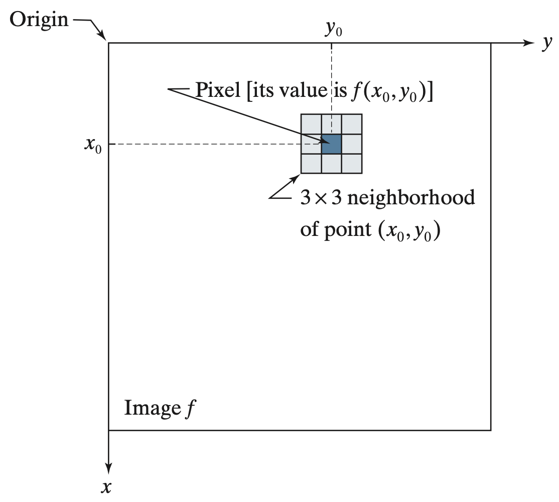 지금까지 언급한 것과 같이 특정 크기 $k$에 해당하는 이웃 픽셀 $S^{k}_{x, y}$을 이용한 연산을 영상 필터링(spatial filtering)이라고 부르면 이때 사용된 연산 $T [\cdot]$을 공간 마스크(spatial mask), 공간 커널(spatial kernel), 공간 윈도우(spatial window)라고 말합니다. 이때, $k = 1$이라면 이 필터링은 이웃에 대한 연산을 수행하지 않기 때문에 점 처리(point processing)이라고 합니다.