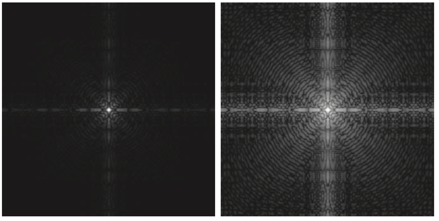 여기서 $c$는 새롭게 추가된 파라미터로 이를 통해서 로그 변환의 정도를 조절합니다. 이 변환은 기본적으로 어두운 영상을 밝게 해주는 효과가 있기 때문에 실제로 자주 사용되는 변환 기법입니다. 예를 들어서 나중에 알아볼 푸리에 변환 스펙트럼의 경우에는 원본 영상이 너무 어두워서 로그 변환을 적절하게 적용하여 밝게 만들어줍니다. 아래의 예시입니다.
