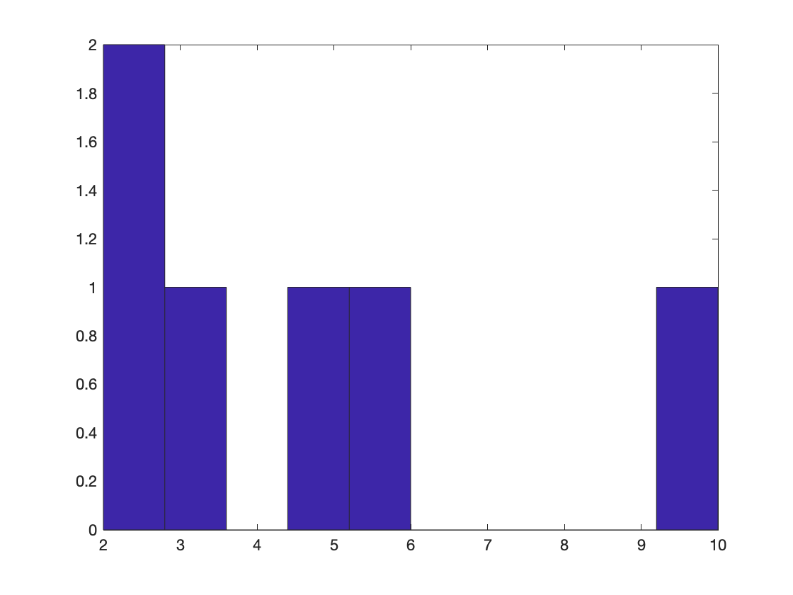 하지만 이렇게만 말하면 애매모호한 면이 있는 거 같습니다. 더 명확하게 표현하는 방법이 있을까요? 여기서 사용할 수 있는 방법이 히스토그램화(histogramming)입니다. 일단 히스토그램이 무엇인지부터 알아보죠. 예를 들어, [2, 2, 3, 5, 6, 10]의 데이터가 있다고 가정했을 때, 저희가 각 데이터의 분포를 잘 보여주고 싶을 때 히스토그램을 사용할 수 있습니다. 위의 예에서 2는 2번, 3, 5, 6, 10은 각 1번 씩 등장하였습니다. 이를 바 그래프로 그린 것을 히스토그램이라고 합니다. 매트랩에서는 아주 간단하게 한 줄의 코드로 히스토그램을 그릴 수 있습니다.
