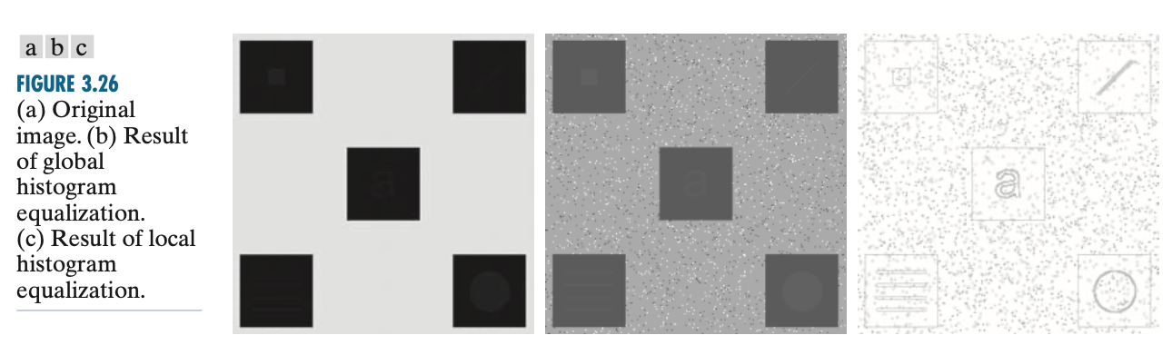 상단의 그림에서 (a)에는 잘 보이지 않지만 노이즈가 존재합니다. 이 영상에 대해서 전역적 히스토그램 평활화를 적용한 (b)를 관찰해보면 노이즈가 더 강조되서 기존 영상보다 품질이 더 떨어진 것을 관찰할 수 있습니다. 이러한 현상은 주로 영상 내에 부드럽고 눈에 띄지 않는 노이즈가 많이 포함되어 있는 경우에 발생합니다. 그리고 $3 \times 3$ 크기의 윈도우로 지역적 히스토그램 평활화를 적용한 (c)를 보면 기존 영상에서 알지 못했던 검은색 상자 안에 있던 문자나 그림을 관찰할 수 있습니다.