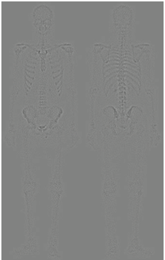 위의 사진은 뼈 감염이나 종양 같은 질환은 감지하는 전신 골격 원자력 스캔입니다. 디지털 영상 처리는 문제 지향형이기 때문에 어떤 문제를 가지느냐에 따라서 서로 다른 방향성을 가지게 됩니다. 저희는 사진에 있는 골격의 디테일을 살리는 것으로 하겠습니다. 지난 포스팅에서 따로 설명은 드리지 않았지만 라플라시안 필터는 영상의 세세한 디테일을 살리는 데 사용될 수 있으며 그래디언트 기반 필터링은 영상 내의 중요한 엣지를 찾아내는 데 도움을 줄 수 있습니다.