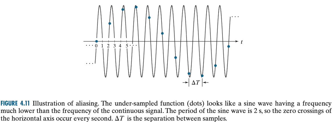 대역 제한 함수에서는 적어도 오버-샘플링 상황에서 완벽한 복원이 가능합니다. 하지만 언더-샘플링에서는 복원 자체가 불가능하게 됩니다. 이때 발생하는 문제를 앨리어싱이라고 합니다. 디지털 영상 처리에서는 앨리어싱뿐만 아니라 다양한 인위적 구조물이 존재합니다. 그중에서도 앨리어싱이 가장 대표적이죠. 앨리어싱이 발생하는 이유는 아래의 그림으로 인해 그렇습니다.