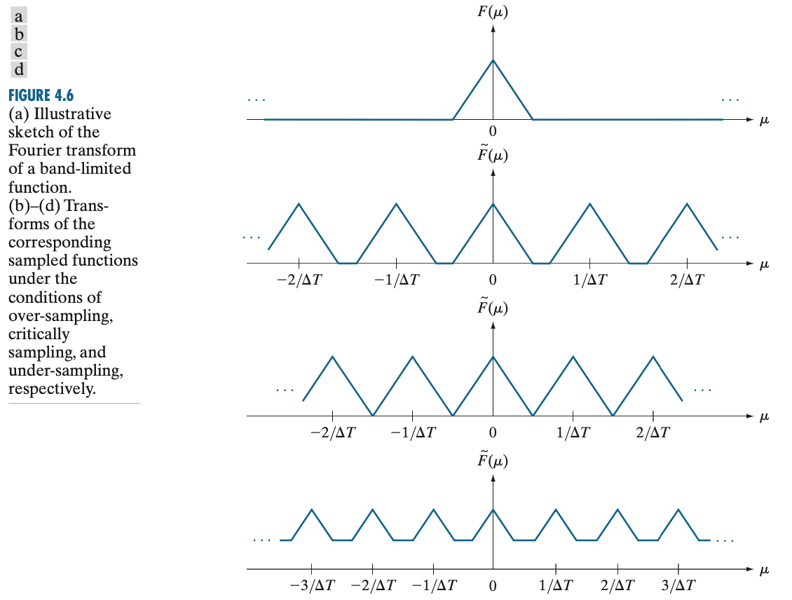 샘플링 속도 $\Delta T$를 좁게 잡으면 $\frac{1}{\Delta T}$는 늘어나게 되어 $F(\mu)$끼리 영향을 주지 않는 오버-샘플링(over-sampling) 결과 (a)를 얻게 됩니다. 그에 반해, 샘플링 속도 $\Delta T$를 크게 잡으면 $\frac{1}{\Delta T}$는 줄어들게 되고 이는 $F(\mu)$끼리 서로 영향을 주게 되는 언더-샘플링(under-sampling) 결과 (c)를 얻게 됩니다. 오버-샘플링과 언더-샘플링 사이에서 균형 있는 샘플링 속도 $\Delta T$를 찾으면 이를 임계 샘플링(critical sampling)이라고 합니다.