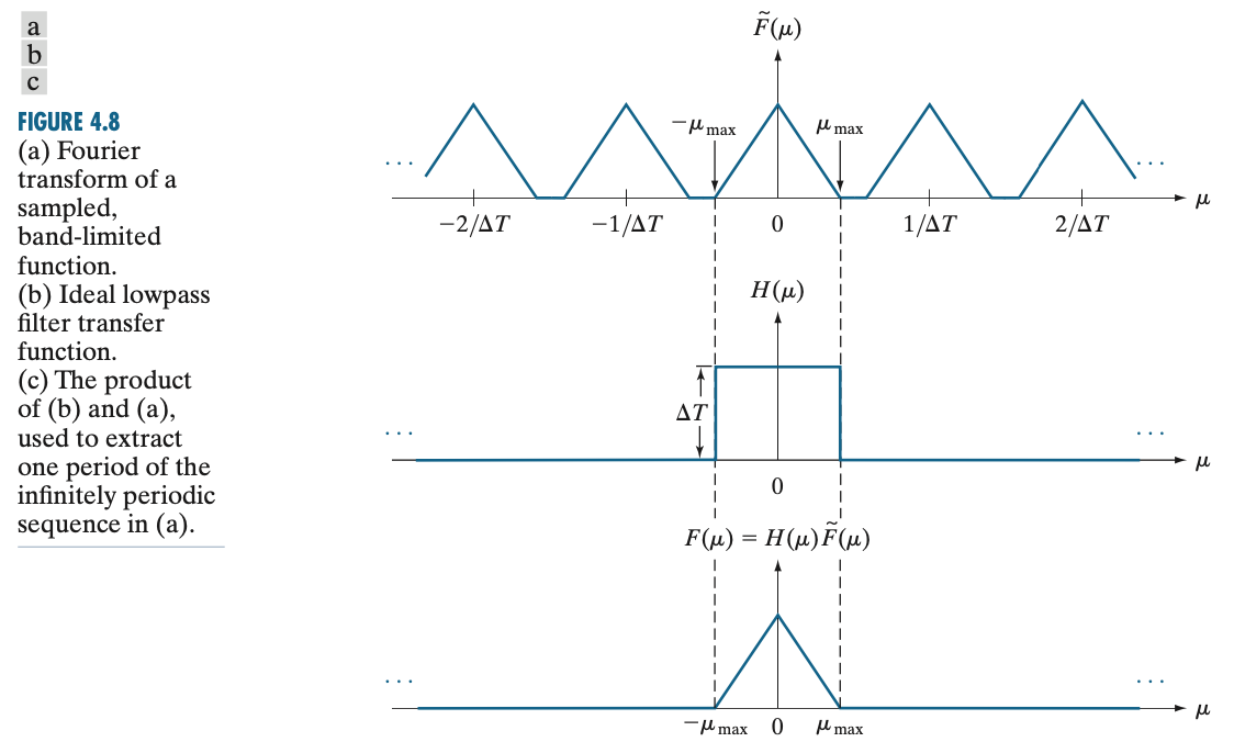 여기서 1이 아닌 $\Delta T$가 붙은 이유는 샘플링된 함수의 푸리에 변환 $\tilde{F}(\mu)$에 $\frac{1}{\Delta T}$가 붙어있기 때문입니다. 따라서 Nyquist 속도 이상으로 입력 함수를 샘플링했다고 가정했을 때, $H(\mu)$를 이용해서 샘플링하면 아래와 같이 정리할 수 있습니다.