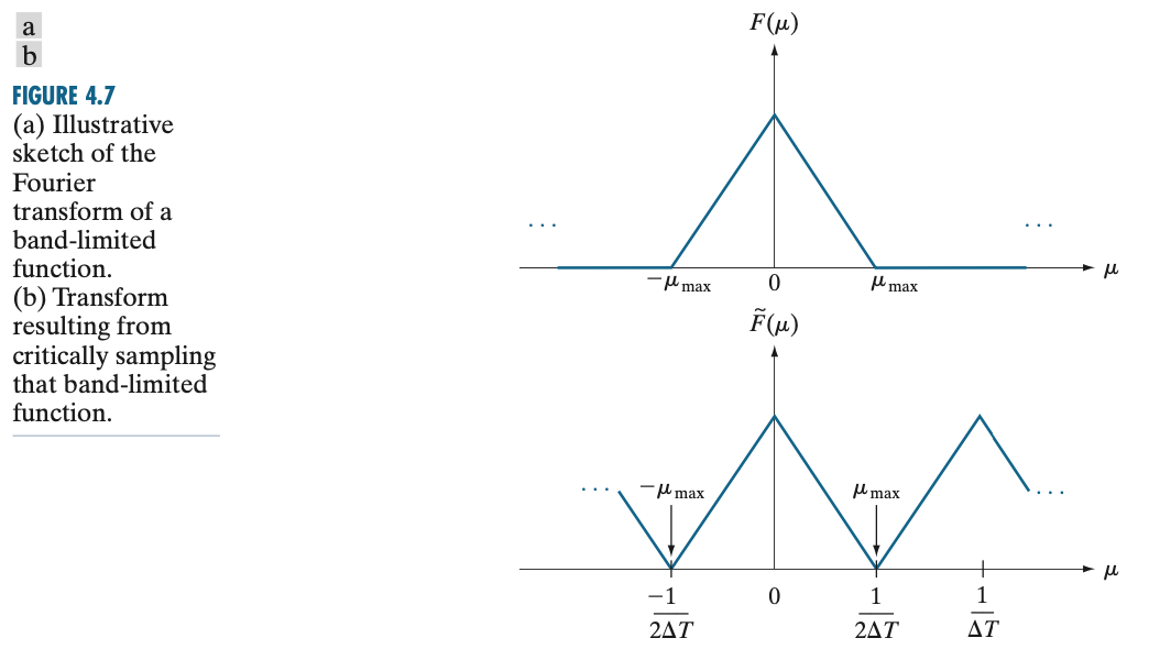 (a)는 위에서 언급한 조건에 부합하는 대역 제한 함수 $f(t)$에 푸리에 변환을 적용한 결과입니다. 특정 구간을 제외하고 나머지 구간에서는 0인 것을 볼 수 있습니다. (b)는 $f(t)$를 $\Delta T$의 샘플링 속도를 가지고 샘플링한 뒤 푸리에 변환을 적용한 결과입니다. 보시면 기존 함수 $f(t)$의 푸리에 변환 함수 $F(\mu)$가 무한 반복되고 있는 것을 볼 수 있죠. 그리고 동일한 함수가 주기 $\frac{1}{\Delta T}$를 가지고 반복되고 있습니다. 이때, $\mu \ge 0$에서 $F(\mu) = 0$이 되는 지점인 $\mu_{\text{max}}$는 $\Delta T$와 어떤 관계를 가지고 있을 까요? 이를 특정 주기를 가지고 무한히 반복되는 주기 함수의 성질을 이용하면 $\mu_{\text{max}} = \frac{1}{2\Delta T}$임을 알 수 있습니다.