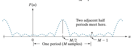 기본적으로 1D DFT를 적용하게 되면 변환의 중심은 원점이 되고 이러한 주기가 $M$이 될 때마다 반복됩니다. 이 부분은 이미 설명드렸습니다. 그렇다면 원점을 중심으로 가지는 1주기 $P_{0}$와 $M$을 중심으로 가지는 2주기 $P_{M}$이 맞닿는 지점은 어디일까요? 바로 $\frac {M}{2} - 1$과 $\frac {M}{2}$ 사이에서 만나게 될 것입니다. 저희가 만약 DFT의 결과를 시각화 또는 중심 영역을 필터링해본다고 가정하겠습니다. 그렇다면 저희는 완전한 한 개의 주기 $P_{0}$이나 $P_{M}$을 추출해내야 합니다. 그런데 $P_{0}$을 추출하려고 봤더니 정의역이 음수에 걸쳐서 선택하기 애매합니다. 그렇다면 $P_{M}$을 선택해볼까요? 하지만 $P_{M}$ 역시 저희가 가지고 있는 전체 샘플의 개수인 $M$ 이상으로 넘어가기 때문에 이 역시 그리 좋은 선택은 아니라고 볼 수 있습니다. 그러므로 저희의 유일한 선택지는 $[0, M-1]$ 구간을 추출하는 방법밖에 없습니다. 그러면 $P_{0}$과 $P_{M}$의 반주기가 추출되었다고 볼 수 있겠죠. 그러나 여전히 불안정합니다. 왜냐하면 애초에 완벽한 한 주기를 선택해야 하는 데 반주기씩 선택했으니까요.