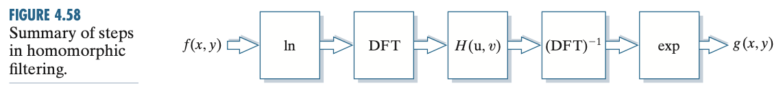 $$\mathcal{F}\{z(x, y)\} = \mathcal{F}\{\ln{f(x, y)}\} = \mathcal{F}\{\ln{i(x, y)}\} + \mathcal{F}\{\ln{r(x, y)}\}$$