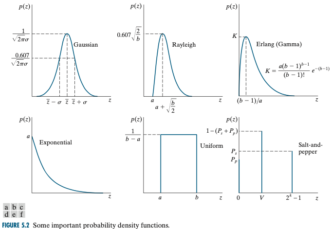 앞으로 설명드릴 노이즈 모델들의 특성들은 노이즈가 따르고 있는 아래의 그림과 같은 확률 밀도 분포(Probability Density Distribution; PDF)에 따라서 달라집니다.
