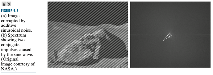 혹시 주파수 공간에서의 필터링에서 노치 필터를 이용해서 반복적인 패턴을 가진 노이즈를 제거하는 방법이 기억나시나요? 이러한 반복적인 패턴의 노이즈는 보통 영상 획득 동안에 전기적 또는 전기 기계 간 간섭에 의해 발생하는 경우가 많습니다. 이번에 설명하는 주기적인 특성이 존재하는 노이즈만큼은 공간에 종속적이라고 가정하도록 하겠습니다. 지난 포스팅에서도 설명드렸지만 노치 필터를 이용하면 아러한 주기적 노이즈를 상당히 많이 제거 가능합니다. 왜냐하면 주기적 특성을 가지는 노이즈들은 보통 주파수 도메인에서 아래와 같이 구별하기 쉽기 때문이죠.