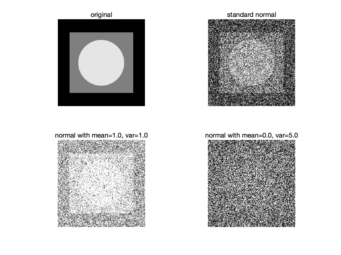 여기서 $\eta(x, y)$는 영상 $f(x, y)$와 크기가 동일하고 위에 나온 정규 분포, 레일리 분포, 일랑, 지수, 균등 분포 중 한 가지가 될 수 있습니다. 예를 들어 정규분포를 따르는 노이즈, 즉 가우시안 분포를 적용하면 아래와 같이 나오게 됩니다.