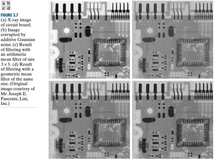 위 영상에서 (b)는 가우시안 노이즈에 오염된 영상입니다. 여기에 산술 평균 필터를 적용한 (c)와 기하 평균 필터를 적용한 (d)를 비교해볼 수 있습니다. 여기서는 두 영상 사이에 큰 차이는 존재하지 않지만 일반적으로 기하 평균 필터가 산술 평균 필터에 비해 디테일에 대한 보존을 더 많이 하는 경향이 존재합니다.