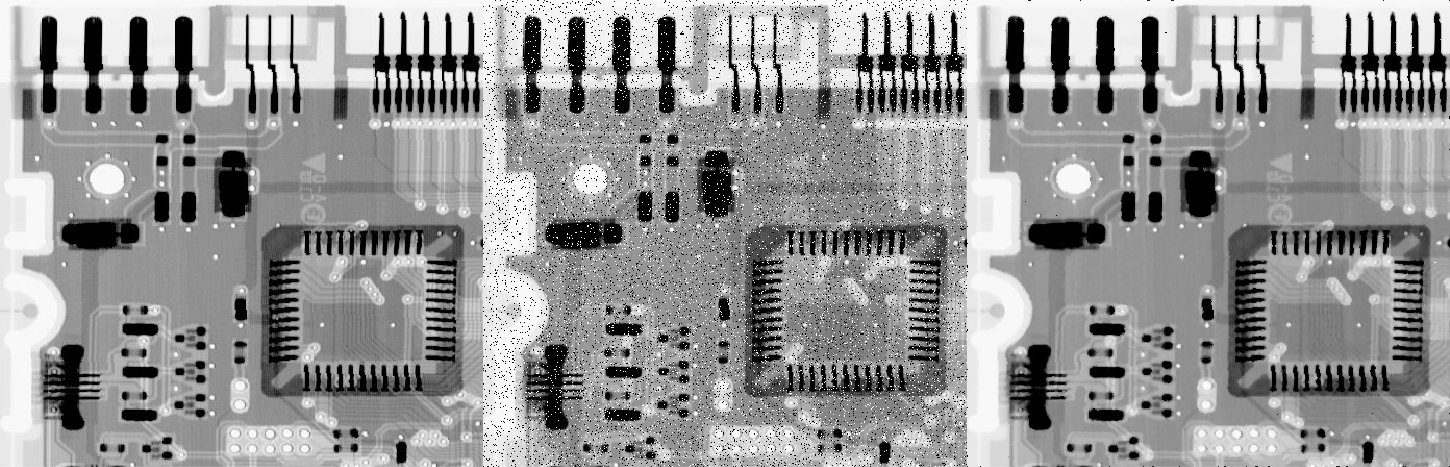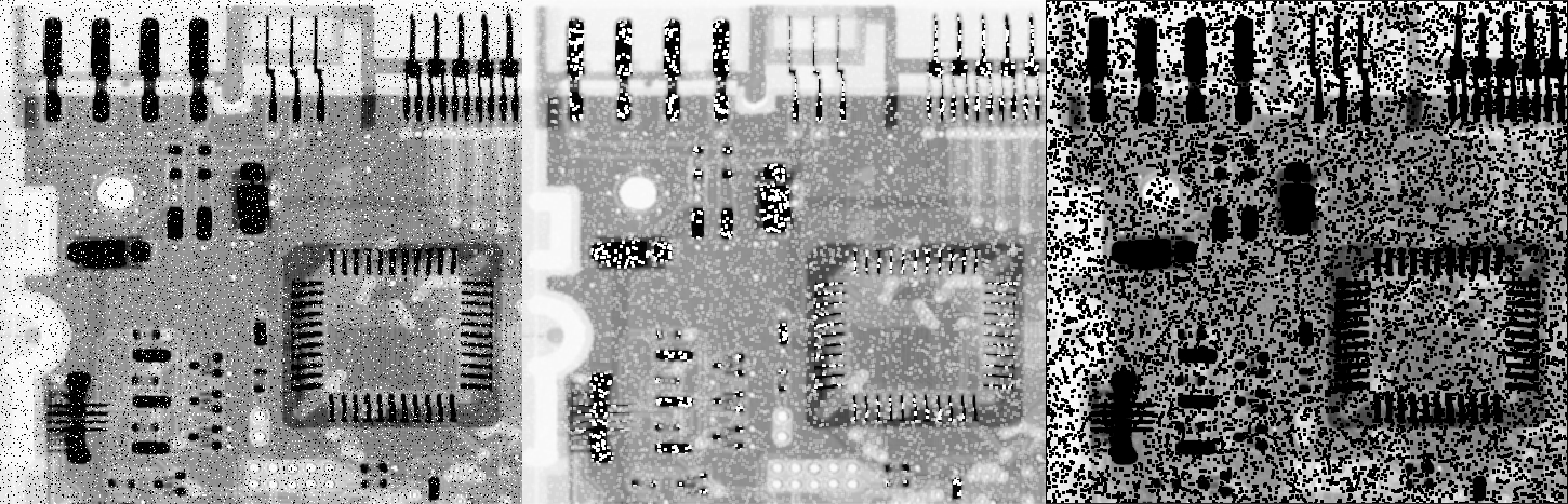 콘트라 조화 평균의 가장 큰 단점은 위와 같이 소금 노이즈와 후추 노이즈가 혼재해있을 때 제대로 동작하지 않는 다는 것입니다. 가운데 그림은 차수를 1.5, 오른쪽 그림은 차수를 -1.5로 지정했을 때 결과로 둘 다 저희가 원치않는 결과를 보여주고 있습니다.