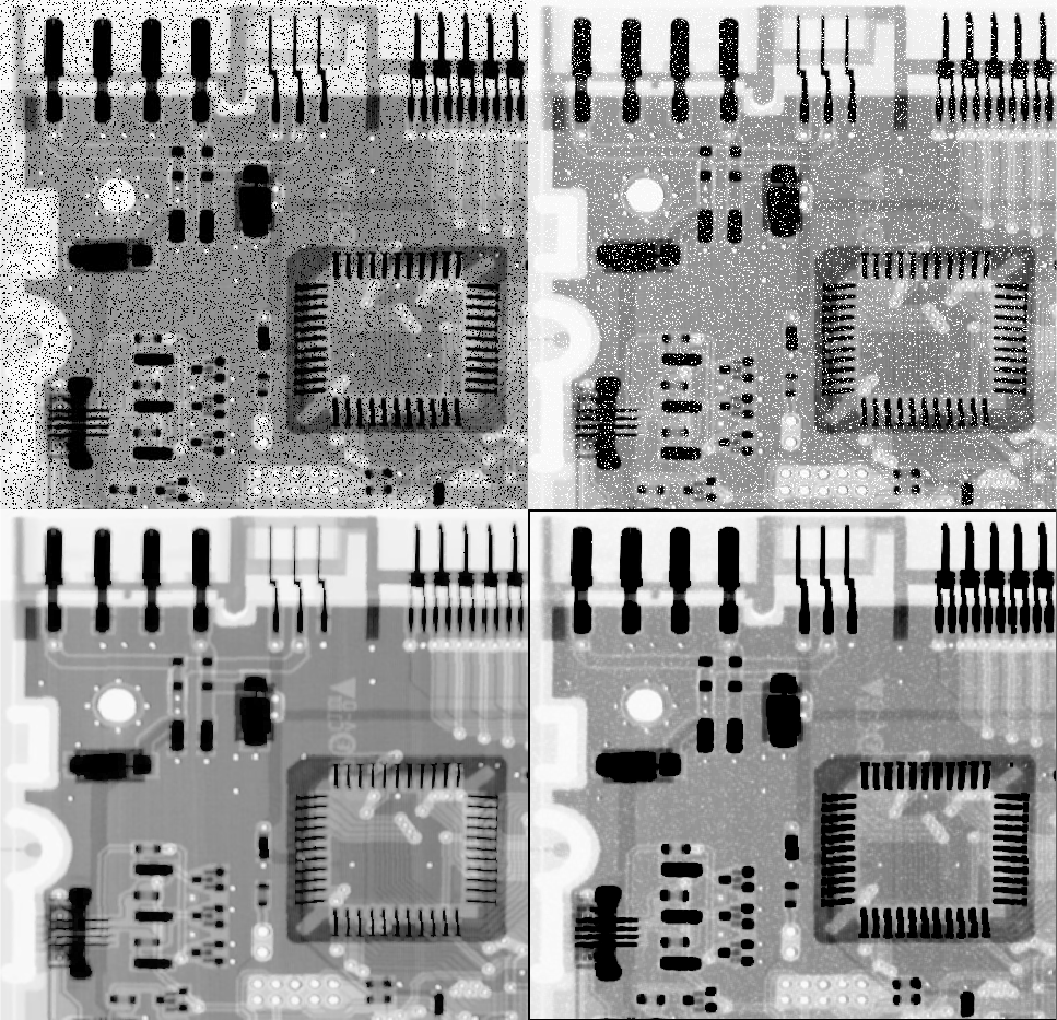 영상 내 노이즈는 1개만 존재하리라는 보장은 없습니다. 위의 영상에서 우측 최상단과 같이 가우시안 노이즈와 소금-후추 노이즈가 혼재할수도 있죠. 이 경우 우측 및 좌측 중앙 영상 처럼 평균 필터를 이용하면 저희가 원하는 결과와 아주 멀게 됩니다. 여기에 좌측 최하단과 같이 중앙값 필터를 적용하면 적어도 평균 필터에 비해서는 낫지만 경계면에서 왜곡이 발생한 것을 볼 수 있습니다. 이를 방지하기 위해 좋은 필터가 바로 알파-트리밍 평균 필터입니다. 위의 예제에서는 윈도우 크기를 5, $d = 6$으로 지정하여 필터링을 적용하였습니다. 그 결과 평균 필터보다는 아주 좋은 결과를 얻었으며 중앙값 필터에 비해서도 왜곡이 덜하게 되었습니다.