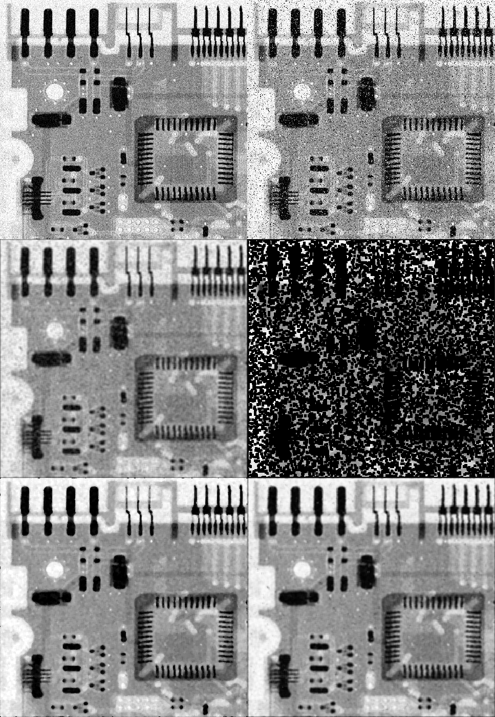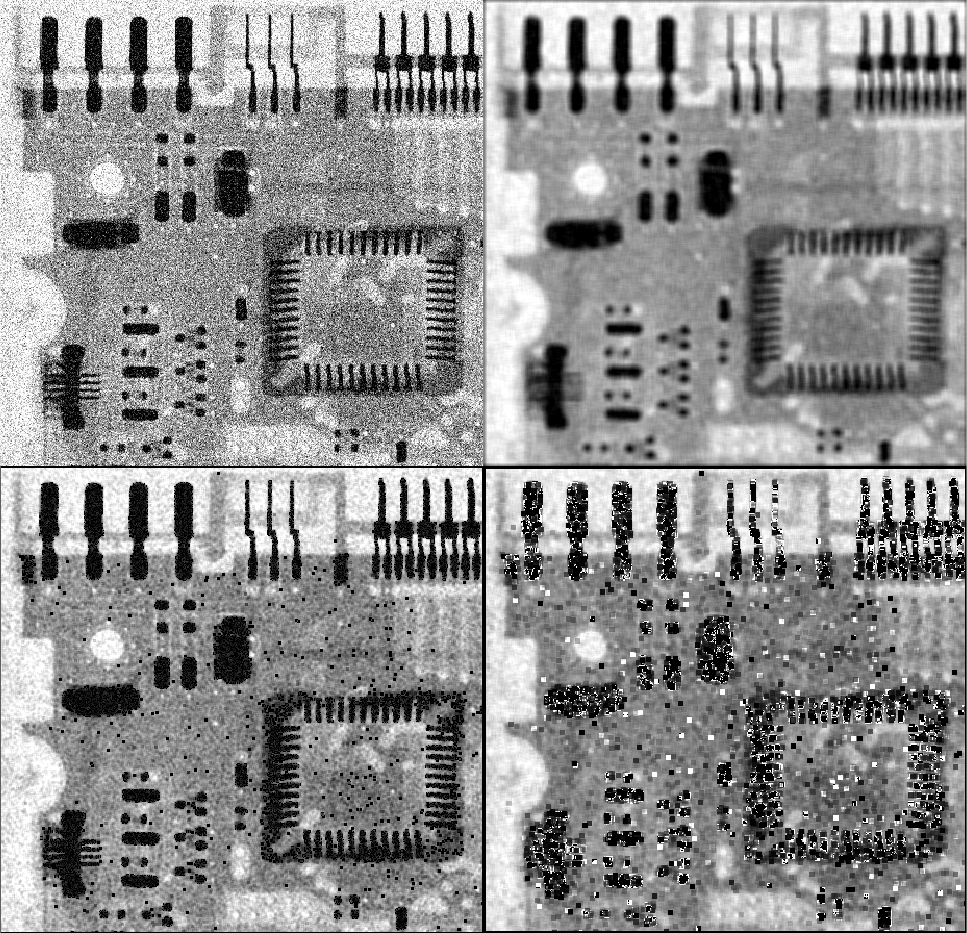 가장 먼저 평균 필터들간의 비교입니다. 좌측 상단은 평균 0, 분산 0.5인 가우시안 노이즈에 오염된 영상입니다. 우측 상단은 윈도우 크기가 7의 산술 평균 필터를 적용한 결과입니다. 그리고 좌측 하단은 윈도우 크기가 3인 기하 평균 필터를 적용한 결과입니다. 산술 평균 필터와 비교해보면 크게 눈에 띄는 점은 2가지입니다. 일단 여전히 노이즈 제거가 제대로 되지 않아서 중간에 검은 노이즈가 존재하고 있습니다. 그리고 비교적 산술 평균 필터에 비해서 영상 내 왜곡이 덜 한 것을 관찰할 수 있습니다. 마지막으로 우측 하단은 조화 필터로 생각보다 좋지 않은 결과를 보여주고 있습니다.