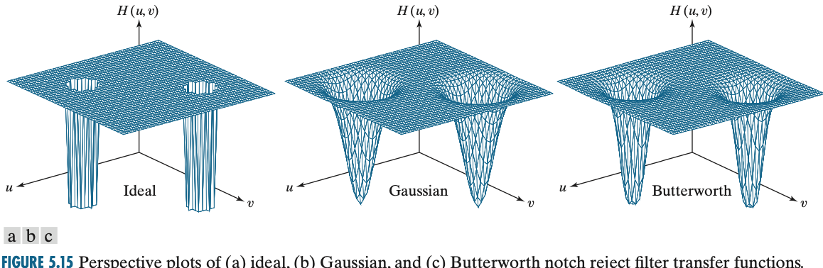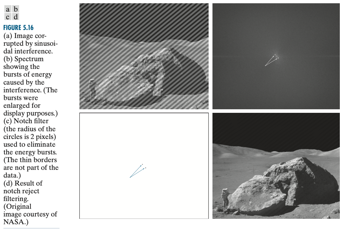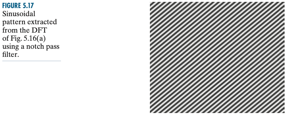 하지만 여기서 노치 통과 필터 $H_{\text{NP}}(\mu, nu)$를 만들 때 주파수 공간에서 어떤 것이 간섭 스파이크인지 신중하게 판단해야합니다. 이 과정은 어쩔 수 없이 $G(\mu, \nu)$ 내에서 발생한 스파이크를 관찰 및 제거를 반복적으로 수행하여 이루어져야만 합니다. 이 과정을 통해 특정 스파이크를 빼는 노치 통과 필터 $H_{\text{NP}}(\mu, nu)$를 결정했다고 가정하면 노이즈는 영상 공간에서 아래와 같이 얻을 수 있습니다.