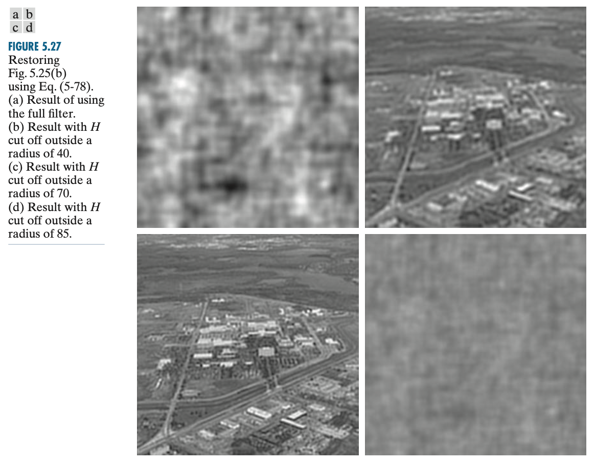 위 그림은 실제로 $H(\mu, \nu)$로 나눌 때 발생하는 문제를 보여주고 있습니다. 첫번째 그림은 모든 영역에 대해서 나눗셈을 적용했을 때 결과입니다. 완전히 이상한 결과가 나왔기 때문에 쓸모없습니다. 두번째, 세번째 영상은 중심 주변으로 $D_{0} = 40, 70$ 내부만 나누었을 때 결과입니다. 확실히 좋은 결과를 보여주고 있습니다. 하지만 통과시키는 영역이 넓어질 수록 그만큼 0을 만날 확률이 높기 때문에 $D_{0} = 85$로 적용했을 때는 완전히 이상한 결과가 나왔습니다.