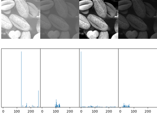 위의 결과를 보도록 하겠습니다. 가장 왼쪽 영상은 다른 영상들에 비해서 굉장히 밝다는 것을 알 수 있습니다. 그리고 그에 대응되는 히스토그램 분포를 보면 전체적으로 100 이상의 영역에 분포해있다는 것을 알 수 있죠. 그리고 두번째 영상은 경계와 객체가 크게 뚜렸하지 않은 저대비 영상입니다. 그리고 그 히스토그램은 아주 좁은 영역에 분포해있죠. 그에 반해 세번째 영상은 고대비 영상입니다. 히스토그램을 보면 두번째 영상의 히스토그램과 비교해보았을 때 전체적으로 분포하고 있음을 알 수 있죠. 마지막 영상은 어두운 영상이기 때문에 히스토그램이 전체적으로 100보다 작은 영역에 분포해있다는 것까지 예측을 할 수 있습니다. 저희의 목표는 고대비 영상을 만드는 것입니다. 따라서 영상의 히스토그램을 변환했을 때 전체적으로 분포할 수 있도록 만드는 알고리즘이 필요하죠. 이러한 알고리즘을 "히스토그램 평활화(Histogram Equalization)"이라고 합니다. 이에 대한 수학적 알고리즘은 아래의 링크를 참조하고 여기서는 생략하도록 하겠습니다.