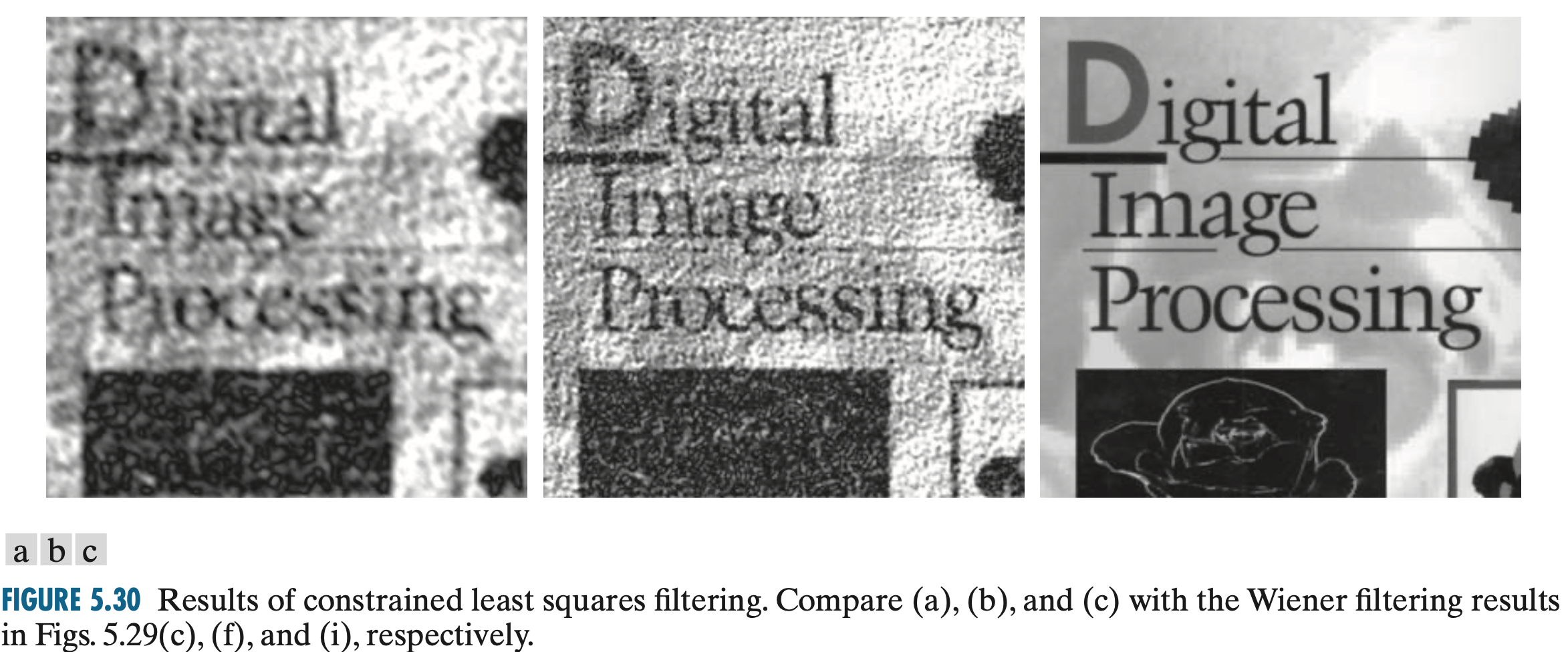 위의 그림은 제한된 최소 제곱 필터링을 이용해서 얻은 결과입니다. 여기서 $\gamma$는 시각적으로 가장 좋은 결과가 되도록 수작업으로 선택하였다고 합니다. 이전 포스팅의 Wiener 필터링과 비교해보면 구조가 많이 살아있는 것을 볼 수 있습니다.