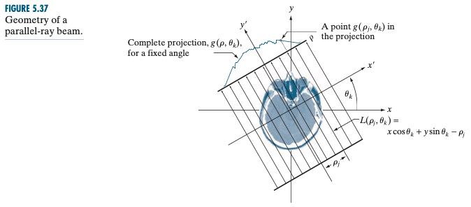 $$g(\rho_{j}, \theta_{k}) = \int_{-\infty}^{\infty} \int_{-\infty}^{\infty} f(x, y) \delta(x\cos{\theta_{k}} + y\sin{\theta_{k}} - \rho_{j}) \; dxdy$$