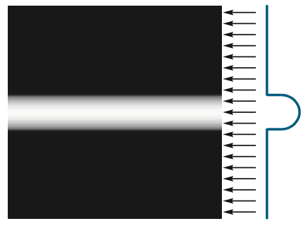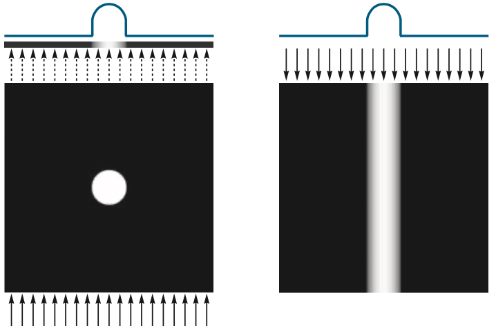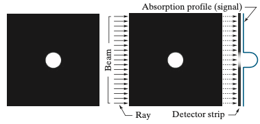 그러면 위에서 오른쪽 그림에서 빔의 방향대로 X-선을 왼쪽에서 오른쪽으로 통과시키고 X-선의 에너지가 배경보다 객체에서 더 많이 흡수한다고 가정하겠습니다. 그리고 오른쪽 끝에 있는 센서가 통과된 X-선을 흡수하여 하나의 스트립을 구성합니다. 따라서 원의 객체가 있는 영역에서만 스트립의 신호 강도가 높은 것을 관찰 할 수 있습니다.