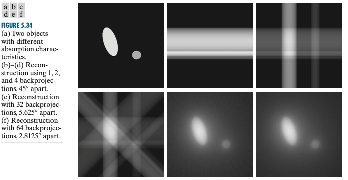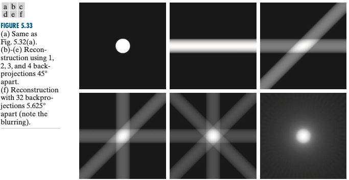 일반적으로 위와 같이 얻은 역투영 영상을 "래미노그램(Laminogram)"이라고 합니다. 래미노그램은 투영이 만들어진 영상 $f(x, y)$에 대한 근사화라고 볼 수 있습니다. 하지만, 그 결과는 저희가 원하는 대로 좋지 않습니다. 다음 포스팅에서는 이를 해결할 수 있는 푸리에-박편 정리에 대해서 알아보겠습니다.