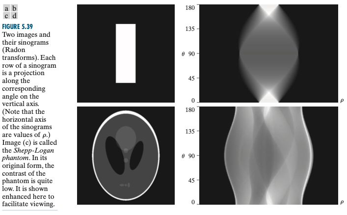 전체적인 개요를 정리하면 먼저, 영상에서 라돈 변환을 통해 각도들에 대한 투영을 계산합니다. 이를 $\rho, \theta$의 데카르트 좌표계로 표현한 것이 시노그램입니다. 역투영을 계산하기 위해서 각도를 고정하고 $\rho$를 바꾸어가며 계산한 뒤 다음으로 각도를 바꾼 뒤 다시 $\rho$를 바꾸는 과정을 반복하여 래미노그램을 얻습니다.
