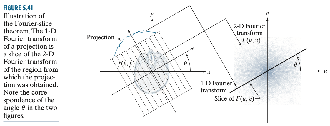 위 그림을 해석하면 더욱 쉽게 이해할 수 있습니다. 특정 각도 $\theta$의 투영 결과인 $g(\rho, \theta)$는 왼쪽 그림의 "Projection"을 의미합니다. 그리고 이것을 1D 푸리에 변환을 하게 되면 주파수 공간에서 투영을 만들었을 때 사용했던 각도 $\theta$인 선을 따라서 $F(\mu, \nu)$를 따라서 값을 추출했다는 의미입니다.