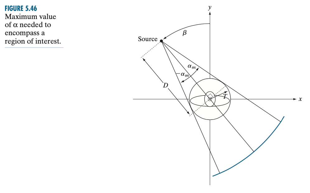 다음으로 $\arcsin{(T/D)}$는 $|\rho| > T$에 대한 최대값 $\alpha_{m}$을 가지고 그 너머에서는 $g = 0$이기 때문에 안쪽 적분의 한계들은 각각 $-\alpha_{m}$, $\alpha_{m}$으로 대체될 수 있습니다.
