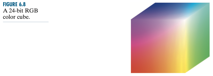 위 그림을 설명하기 위해서 한 가지 중요한 용어인 화소 깊이(pixel depth)를 설명해야할 거 같습니다. 화소 깊이란 각 칼라(R/G/B)를 구성하기 위해 사용된 비트의 수를 의미합니다. 예를 들어, R/G/B의 각 칼라가 8비트로 구성되면 총 24비트의 픽셀 깊이를 가지게 됩니다. 일반적으로 24비트 RGB 칼라 영상을 "풀 칼라(Full-Color)" 영상이라고 하고 이를 위의 그림과 같이 표현하게 됩니다. 그리고 풀 칼라 영상에서 표현할 수 있는 색의 수는 $2^{24} = 16,777,216$개입니다.