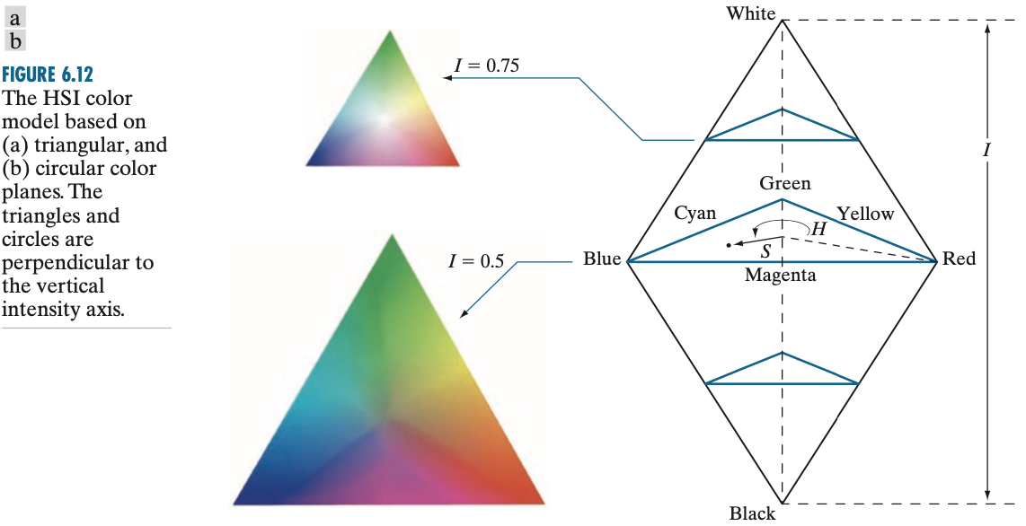 마지막으로 밝기는 3차원 상에서 높이로 표현됩니다. 아주 간단합니다. 이외에 HSI에서 RGB로의 변환거 그 역변환에 대한 설명이 있지만 이 부분은 다루지 않도록 하겠습니다. 궁금하신 분들은 아래의 링크를 참조해주시길 바랍니다.