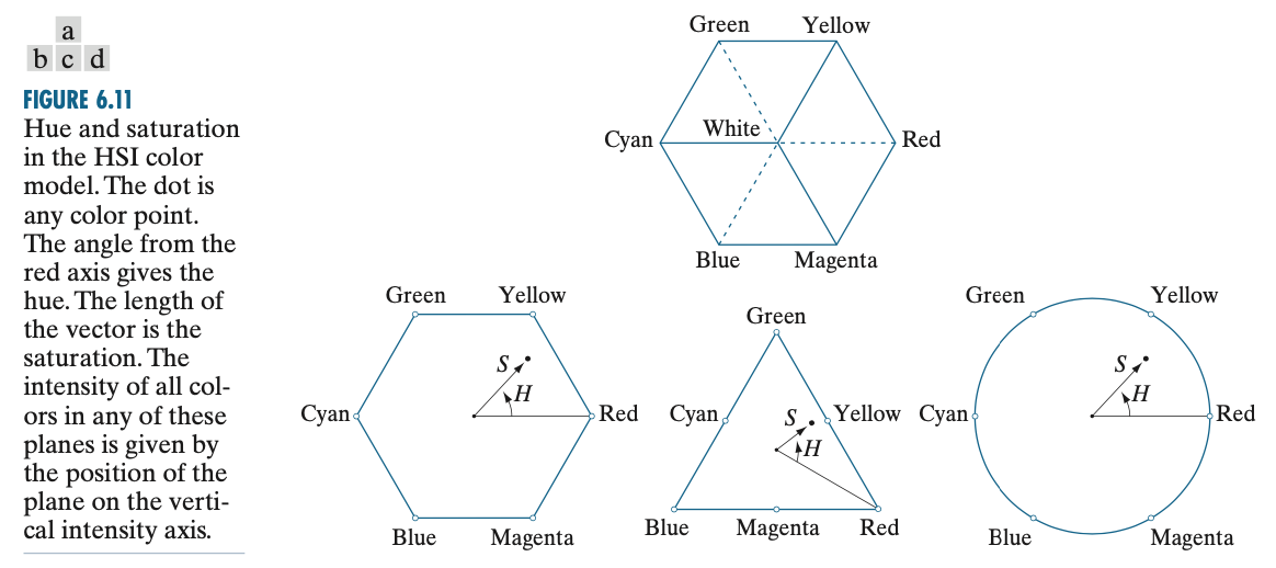 HSI 칼라 모델에서 색상은 Red를 기준으로 하는 각 칼라의 각도로 표현됩니다. 그래서 Red라면 H = 0이 됩니다. 채도는 중심에서 해당 칼라까지의 거리로 표현됩니다.