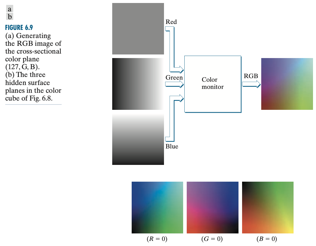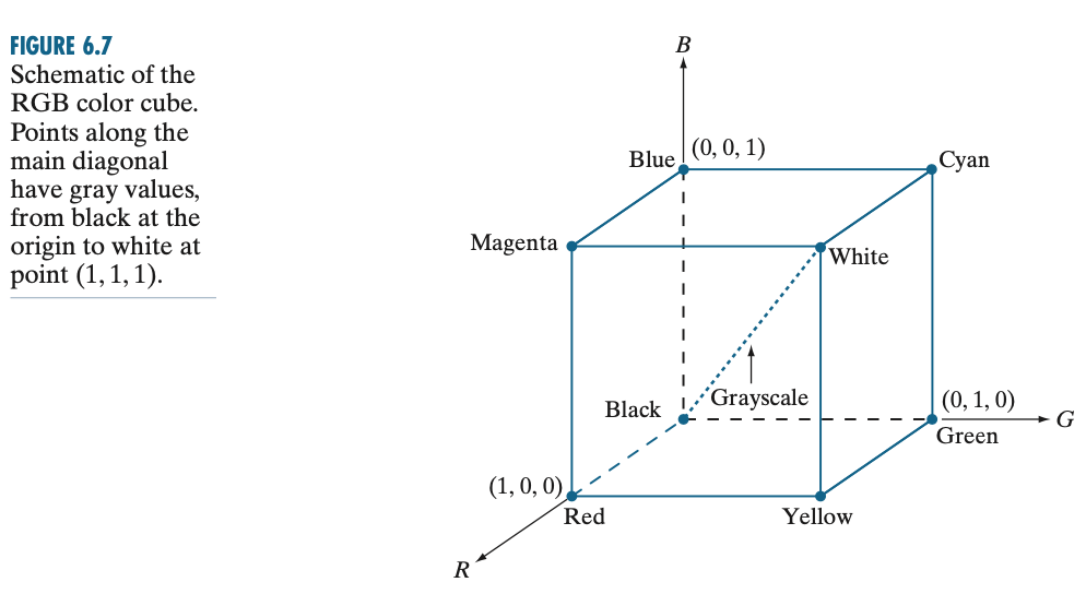 RGB 모델은 저희가 가장 잘 알고있는 칼라 모델입니다. 각 칼라는 적색, 녹색, 청색 스펙트럼 성분들에 의해 나타납니다. 이 모델은 3차원 데카르트 좌표계를 기반으로 하기 때문에 0부터 1 사이로 정규화하여 아래와 같이 표현합니다.