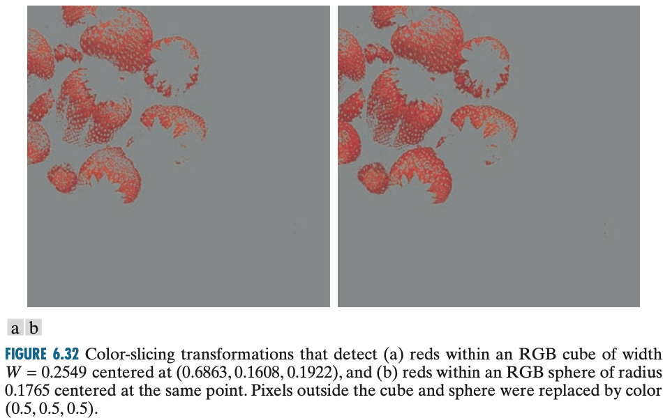 칼라 슬라이싱을 수행하는 가장 쉬운 방법은 관심 범위 밖의 칼라는 회색 칼라로 매핑하는 것입니다. 관심 칼라가 폭이 $W$인 큐브($n \ge 3$이면 하이퍼 큐브) 내에 있고 $(a_{1}, a_{2}, \dots, a_{n})$ 성분을 중심으로 한다고 할 때 필요한 변환 함수는 아래와 같이 정의할 수 있습니다.