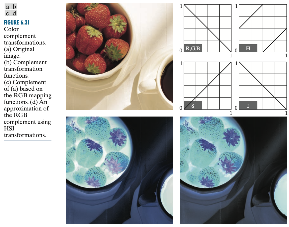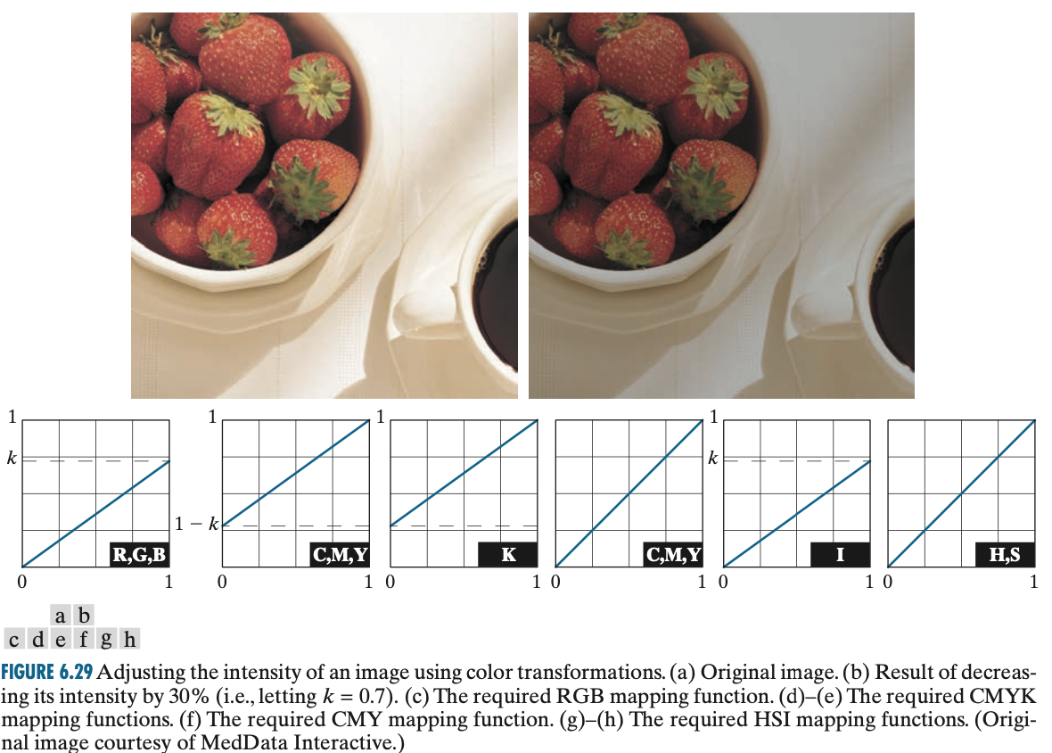 위의 공식을 이용하면 지금까지 저희가 알아본 어떠한 변환도 칼라 영상에 적용할 수 있습니다. 하지만, 어떤 연산은 특정 칼라 공간에 더 적합한 경우가 많기 때문에 직접 칼라를 변환해보면서 찾아보야아합니다. 그리고 동일한 변환이라고 하더라도 각 칼라 공간에 대해서는 공식이 달라질 수 있습니다. 예를 들어서 입력 영상의 밝기(intensity)를 선형적으로 변환시킨다고 가정하면 RGB, HSI, CMY 칼라 공간에서는 아래와 같이 모델링 됩니다.