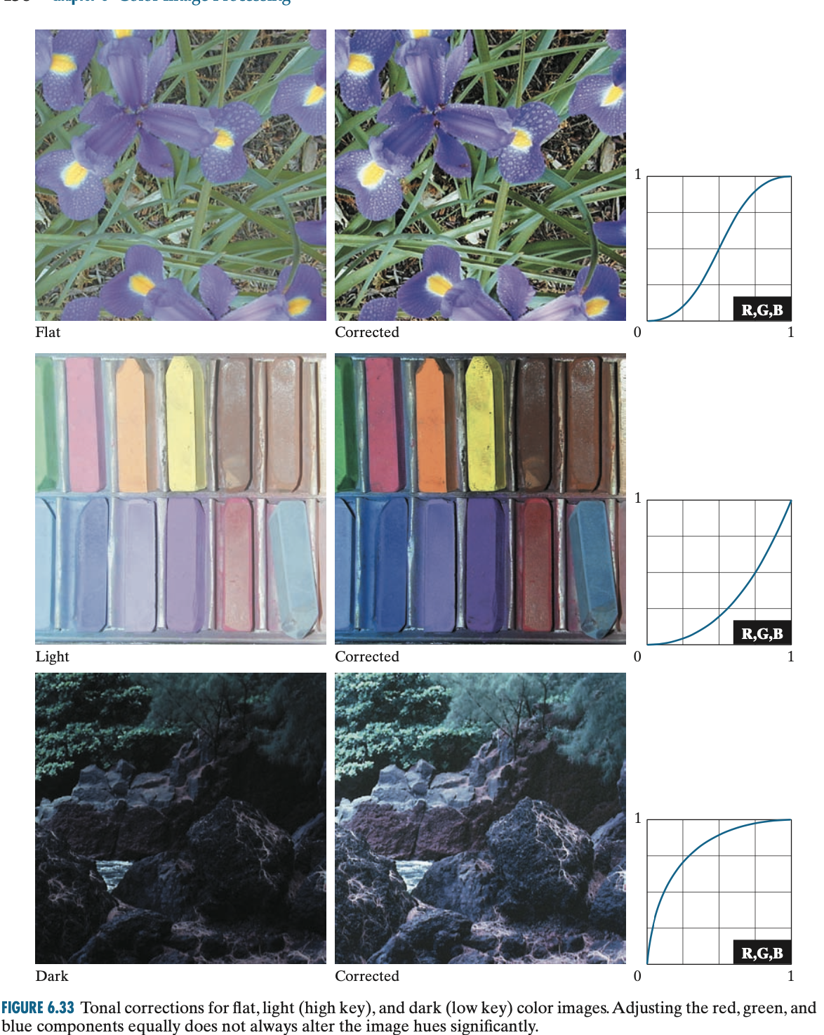 여기서 $i = 1, 2, \dots, n$입니다. $r_{i}$과 $s_{i}$를 각각 $f(x, y)$와 $g(x, y)$의 칼라 성분들을 나타내는 변수들, $n$을 칼라 성분의 수, $\{T_{1}, T_{2}, \dots, T_{n}\}$은 $s_{i}$를 만들기 위해 $r_{i}$에 연산되는 변환 또는 칼라 매핑 함수들의 집합입니다. 예를 들어 RGB 칼라 공간에서 어떤 변환을 하게 되면 $n = 3$이 되고 각 칼라 성분 마다 다른 변환 함수 $\{T_{R}, T_{G}, T_{B}\}$가 정의됩니다. 그리고 $T_{R}$을 사용하면 입력된 RGB 칼라 벡터가 R 성분의 값을 하나 만들게 되는 것이죠.