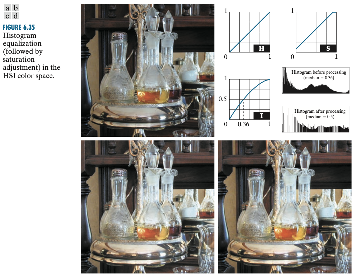 칼라 영상에서의 히스토그램 평활화 역시 동일하지만 일반적으로 HSI 칼라 공간 중 I 칼라 성분에만 적용하는 것이 이상적인 방법임이 알려져 있습니다.