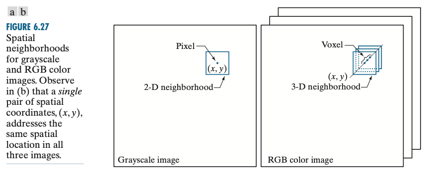왼쪽 그림은 그레이 스케일 영상에서의 공간 필터링, 오른쪽 그림은 칼라 영상에서의 공간 필터링 연산 과정을 보여주고 있습니다. 두 연산의 가장 큰 차이점은 스칼라 값을 필터링 하는 것인지, 벡터를 필터링하는 것 인지 입니다. 이제 칼라 영상을 다루게 되면 칼라 성분을 하나의 벡터로 하여 연산을 수행합니다.