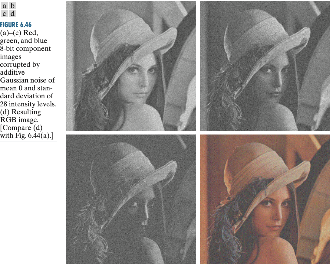 칼라 영상에서는 칼라 성분 별로 서로 다른 노이즈가 적용되거나 특정 칼라 성분에만 노이즈가 적용될 수도 있습니다. 예를 들어 CCD 센서로 칼라를 변환한다고 했을 때, R 센서에 문제가 있다면 RGB 채널 중 R 채널에만 영향을 받겠죠.