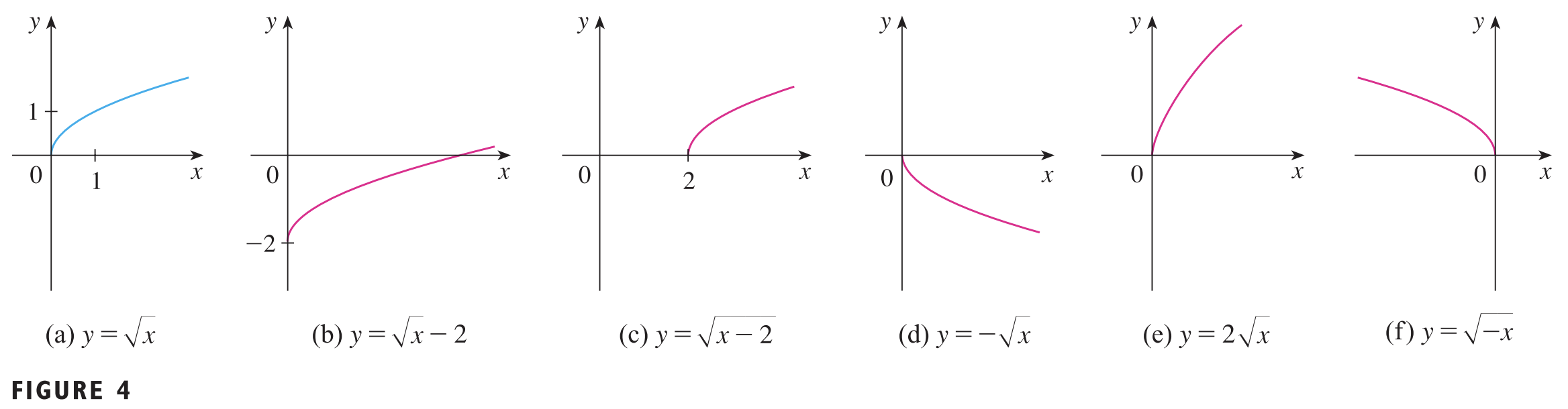 위 그림과 같이 위의 연산을 통해서 저희가 보았던 기초 함수들에 다양한 변환을 해볼 수 있습니다. 그림을 보시면 제곱근 함수에서 이동, 반사, 늘이기를 통해서 다양한 함수들이 만들어지는 것을 볼 수 있습니다.