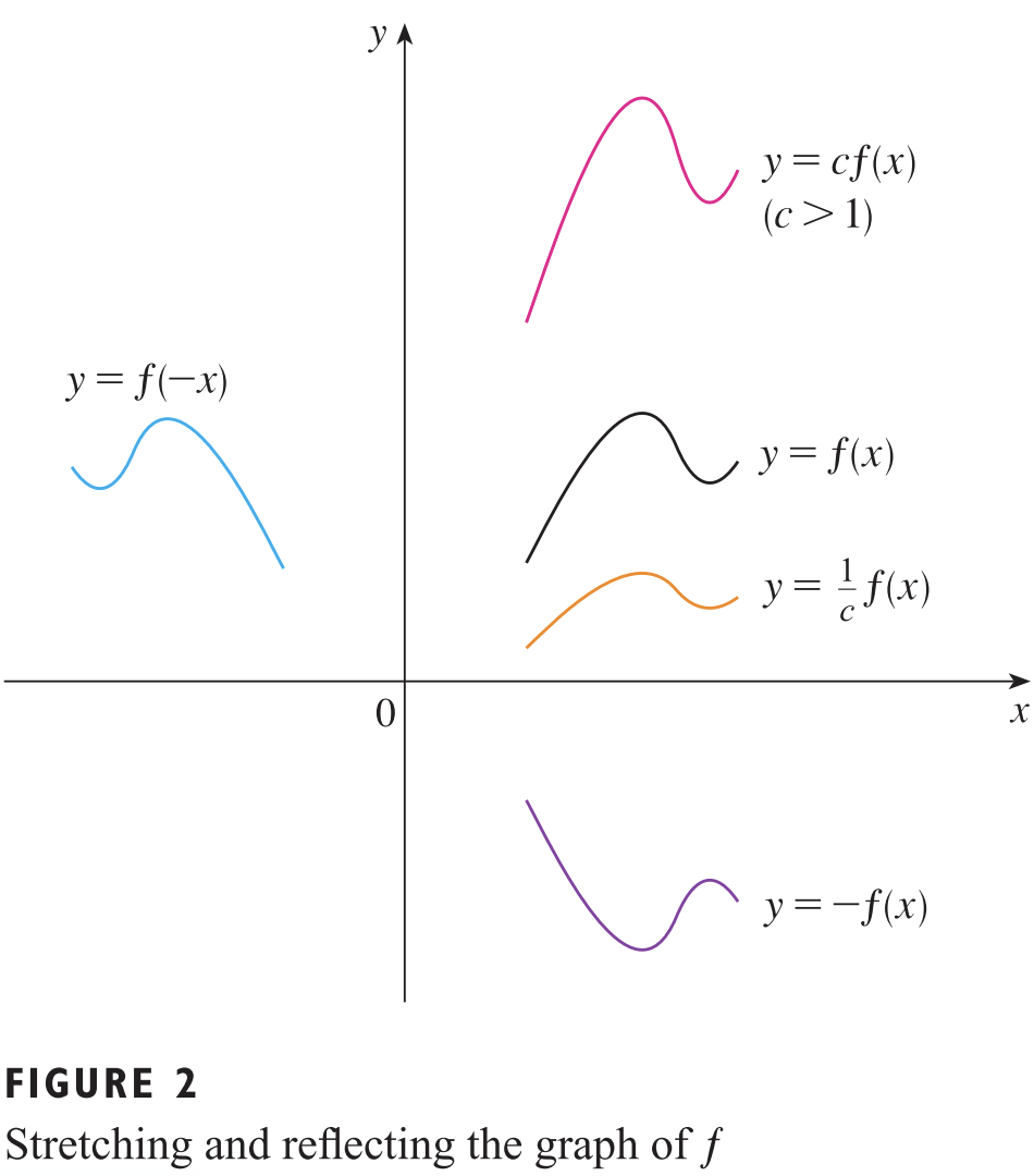 다음으로 함수의 늘이기 및 반사입니다. 위의 그림과 같이 $c$를 곱하거나 나눔으로써 이루어지는 연산입니다. 잘 보시면 $cf(x)$는 $y$ 방향으로 더 늘어난 것을 볼 수 있고 $\frac{1}{c}f(x)$는 $y$ 방향으로 더 압축되었습니다. 위 그림에서는 나오지 않았지만 만약 $f(cx)$를 하게 되면 어떻게 될까요? $f(x)$는 $x$ 방향으로 압축됩니다.