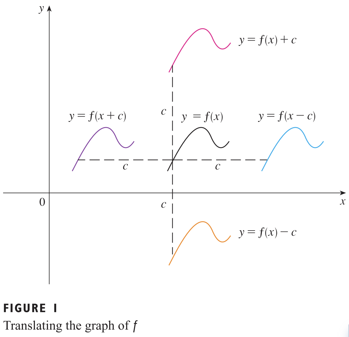 먼저, 함수의 이동입니다. 위의 그림과 같이 $c$를 더하거나 뺌으로써 이루어지는 연산입니다. 잘 보시면 $f(x - c)$는 $f(x)$와 비교했을 때 $c$만큼 $x$축으로 평행이동 한 것을 볼 수 있습니다. 그리고 $f(x) + c$는 $c$ 만큼 $y$ 방향으로 평행이동 한 것이죠.